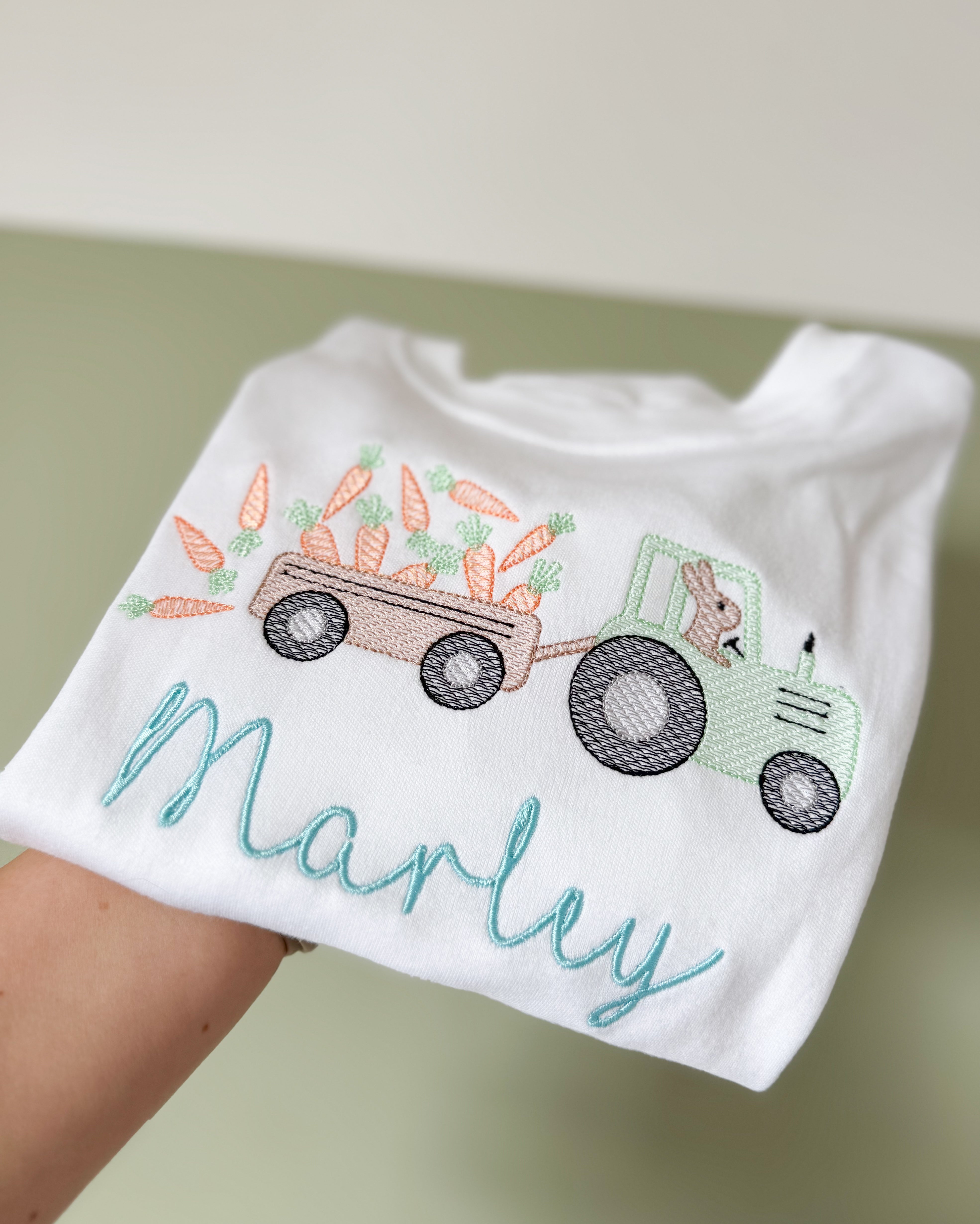 Celebrate Easter with our adorable farmer bunny T-Shirt, featuring a tractor and trailer design with a bunny driver and carrots spilling out of the trailer and of course, personalised with a name of your choice.